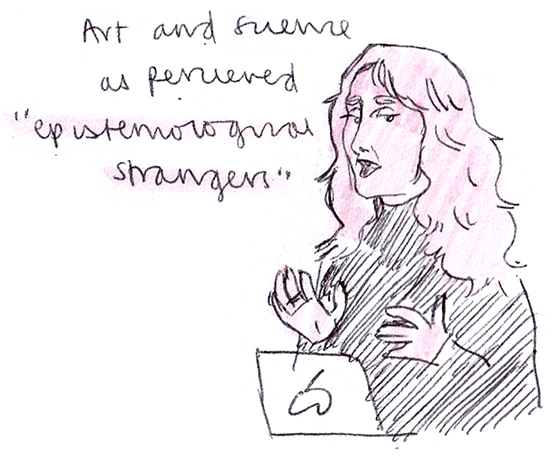 As a visual anthropologist, I’ve joined the conference to see how these understandings of science and technology shape our storytelling and understandings of what it means to be human. As someone working in multimodal research translations, I am using the conference as an opportunity to think about how signals and noise paradigms present novel ways of thinking about climate storytelling and more-than-human ontologies, considering climate breakdown as signal or noise, and beginning to rethink power dynamics between narrative and storytelling power. I am documenting conference events through drawings, seeing the process as an opportunity to consider how to separate signals from noise.