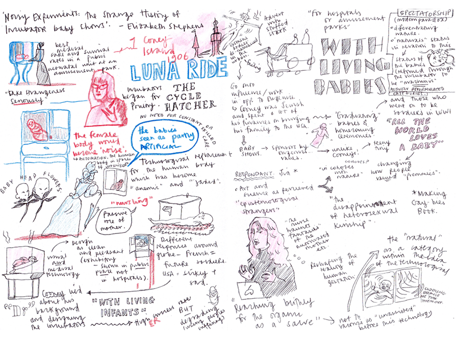 Elizabeth Stephens’ continues this thinking across these machine:human categorisations. In the keynote Noisy Experiments: the Strange History of Incubator Baby Shows, Stephens explores the role of Incubator baby shows from the 1890s until the 1940s. These incubators, often dubbed as “artificial mothers” or “automatic nurses,” sat at the intersection of science and public spectacle, exemplifying the “shifting” boundaries between human and machine. Following this keynote, Stephens and Jaya Keaney reflect on how human and machine dichotomies are too simplified, erasing histories in which humans have been assisted by technological advancements. Keaney comments that too often, when holding the human to the machine, we are “reaching blithely for the organic as a salve” rather than holding space for the inevitable overlaps we see in modern medical technologies. In this way, the presenters begin to question at what end the human body works as signal or noise – or both.