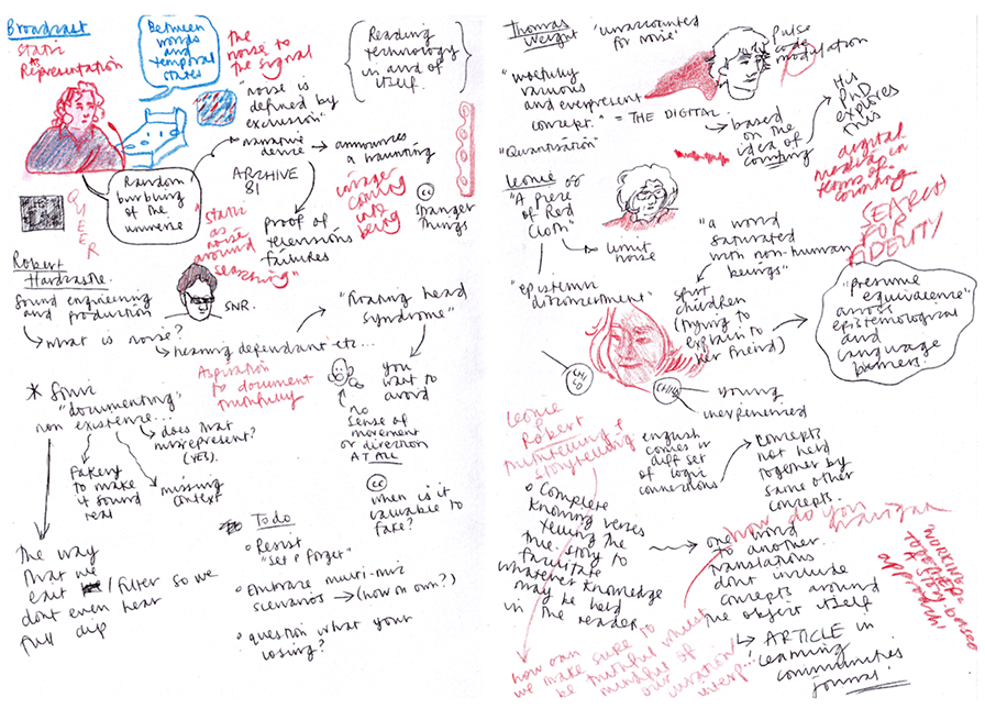 Drawing can work in these contexts as a form of embodied processing, for both maker and viewer. For the maker, the hand negotiates between what is heard, how that is interpreted, and then the formation of thoughts and conceptions. No two makers will hear and interpret the same and thus drawing becomes a channel through which to create a personalised organization of signal and noise. For viewers, these images can begin to bridge gaps in understanding, interpretation, and creation. By reflecting on what is missing or present in these images, they might consider their own interpretations and takeaways – their own assumptions and considerations of signal and noise.