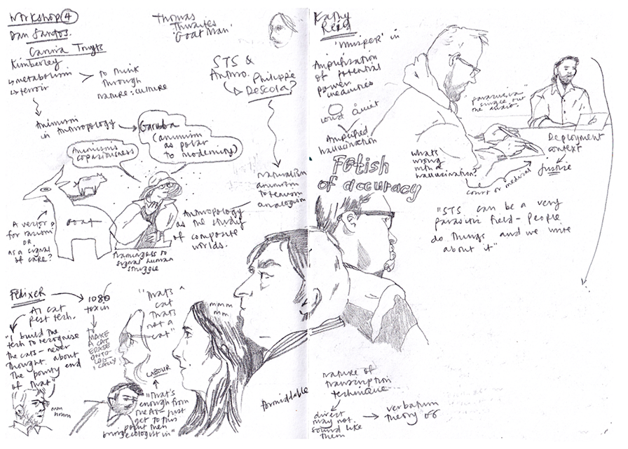 Furthermore, the embodied process of drawing works beyond just the moment of creation. As I sit here, rebuilding AusSTS in my mind, the drawings from those few days work as mnemonic signals to help me clarify these memories through the noise of life and the passage of time. But they also work as connections. Throughout AusSTS, fellow academics and artists alike approached me to discuss the images, reflecting on how working in this way might open paths for new ways of analysing and understanding what we had heard over the three days. We reflected and imagined through layers of technology, time and story. As in Voyce Walkr, when we sat around the proverbial campfire of the future, we began to ask: What will the legacies – or ruins – of our signals and noises say? Will they be obedient and defined? If so, who will define them? Will they distinguish signal from noise? Or will they continue to shift away from categorization, flickering in the peripheries of the fire light?