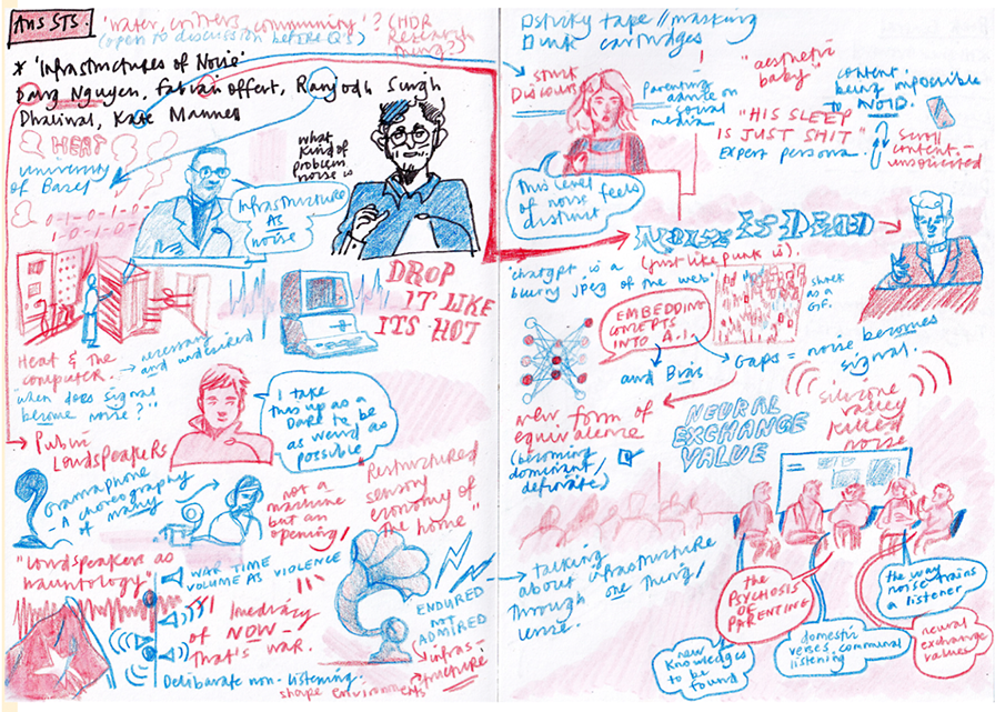 As I pull these strings of enquiry together through the pages of my sketchbook, it becomes clear that many of these explorations are questioning and playing with noise and signals as lenses for reshaping understandings through storytelling. In the ‘Making and Doing’ sections of the events, artists and academics intercept, merge and challenge these categorizations. Anna Raupachis’ (ANU) piece Diffractive mega-constellations: creating embodied relationships with satellite imagery, works with intercepting data from an older, malfunctioning lower orbital space weather satellite. Raupachis intercepts these malfunctioning signals via radio frequency, decodes them through drawing, then re-codes them using Neural Radiance Field imaging. By following this noise to signal and back again, their work amplifies how discarded, unconsidered noise might work to represent what is often overlooked in conventional narratives of data networks. Similarly, in the workshop Surfacing Urban Water, with Alexandra Crosby, Sarah Jane Jones (UTS) and I, we explore how photodiagramming – a protocol based on ethnographic and visual communication methods – might work to separate, read, analyse, document, and share watery urban ecologies, separating them from urban noise.