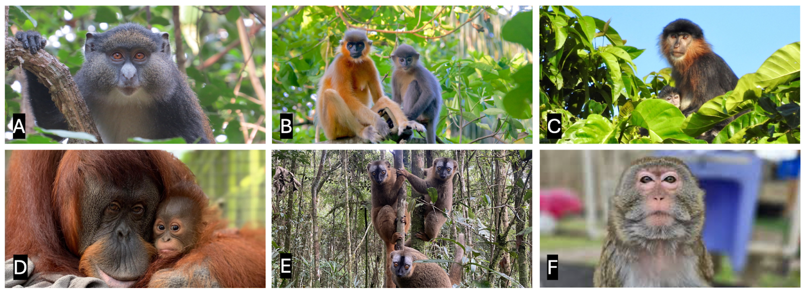 Fig. 1 Hybrid primates, whose lives cross lines of species purity as they grapple with ecological and anthropogenic change. These selected examples demonstrate a range of hybridization in non-human primates, occurring in both wild and managed captive settings, across genera, clades, and continents. (Sources for images of hybrid primates: A. A hybrid guenon monkey. B. A female capped langur and her hybrid offspring. C. A putative intergeneric hybrid in Borneo. D. A hybrid, sanctuary-housed orangutan with her daughter. E. A group of red-fronted brown lemurs--which recent genomic analyses suggest may have hybrid ancestry. F. A hybrid macaque monkey.)