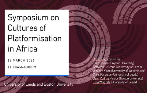 “Cultures of Platformization in Africa” brought together scholars from across Africa, the United Kingdom, and the United States, who examined platformization through a range of perspectives and empirical contexts. The all-day symposium took place on March 13, 2026, at the University of Leeds and online. The organizing committee included Chris Paterson (University of Leeds), Cathleen LeGrand (University of Leeds), Jörg Wiegratz (University of Leeds), Daivi Rodima-Taylor (Boston University), Leah Komen (Daystar University), and Winston Mano (University of Westminster).